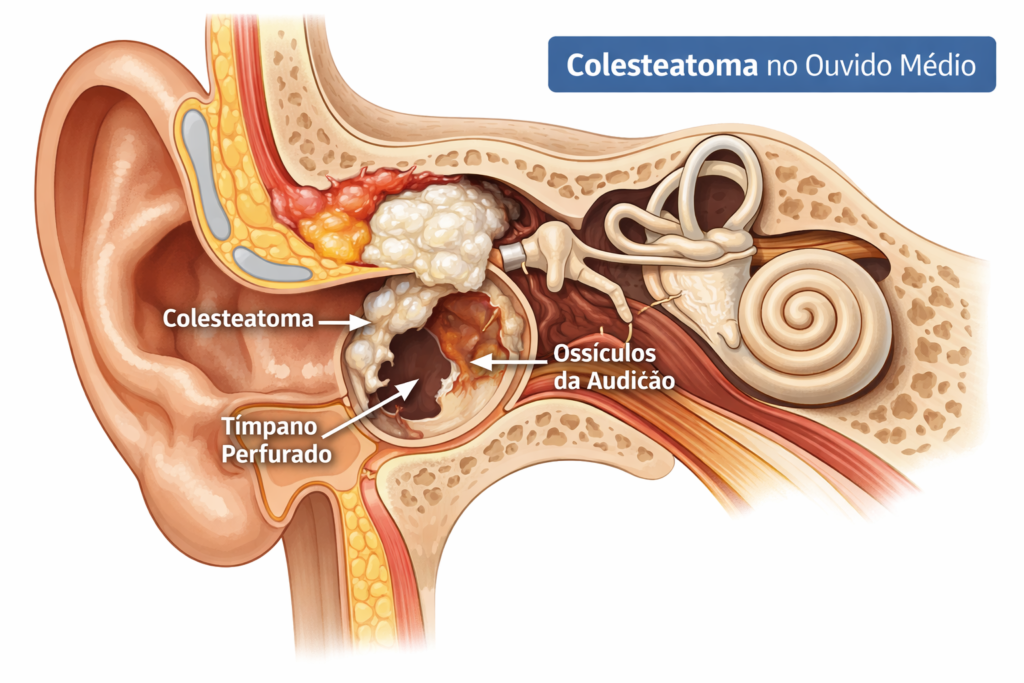O que é colesteatoma no ouvido? O colesteatoma é o crescimento anormal de pele dentro do ouvido médio, atrás do...